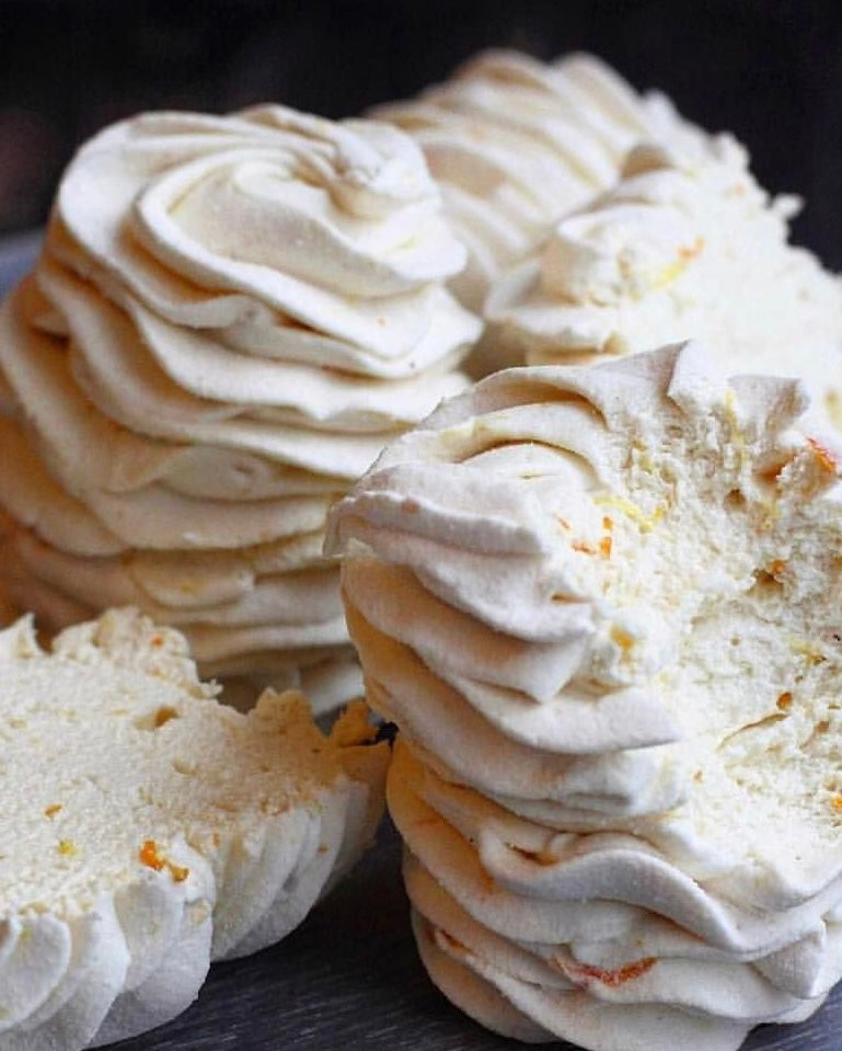 Ingredients: egg white, sugar, agar, apples and orange zest.