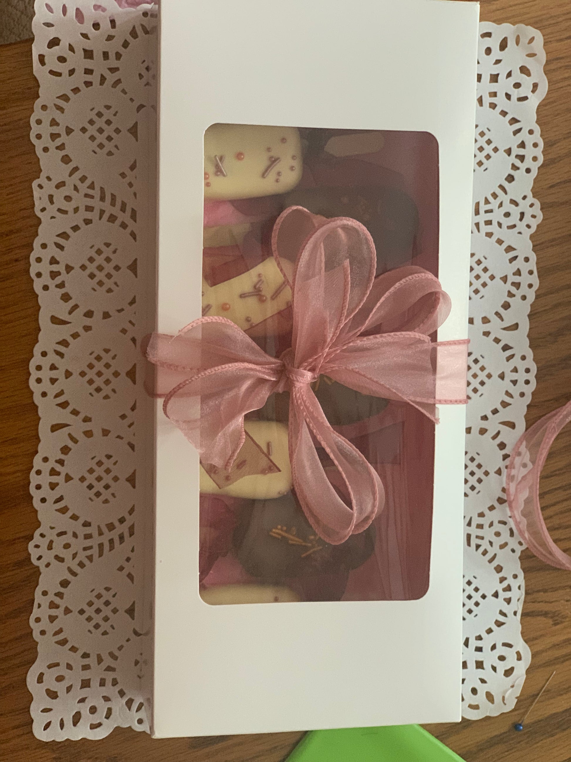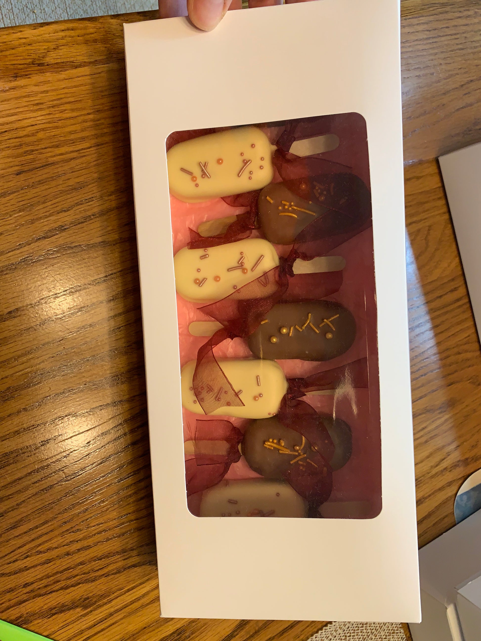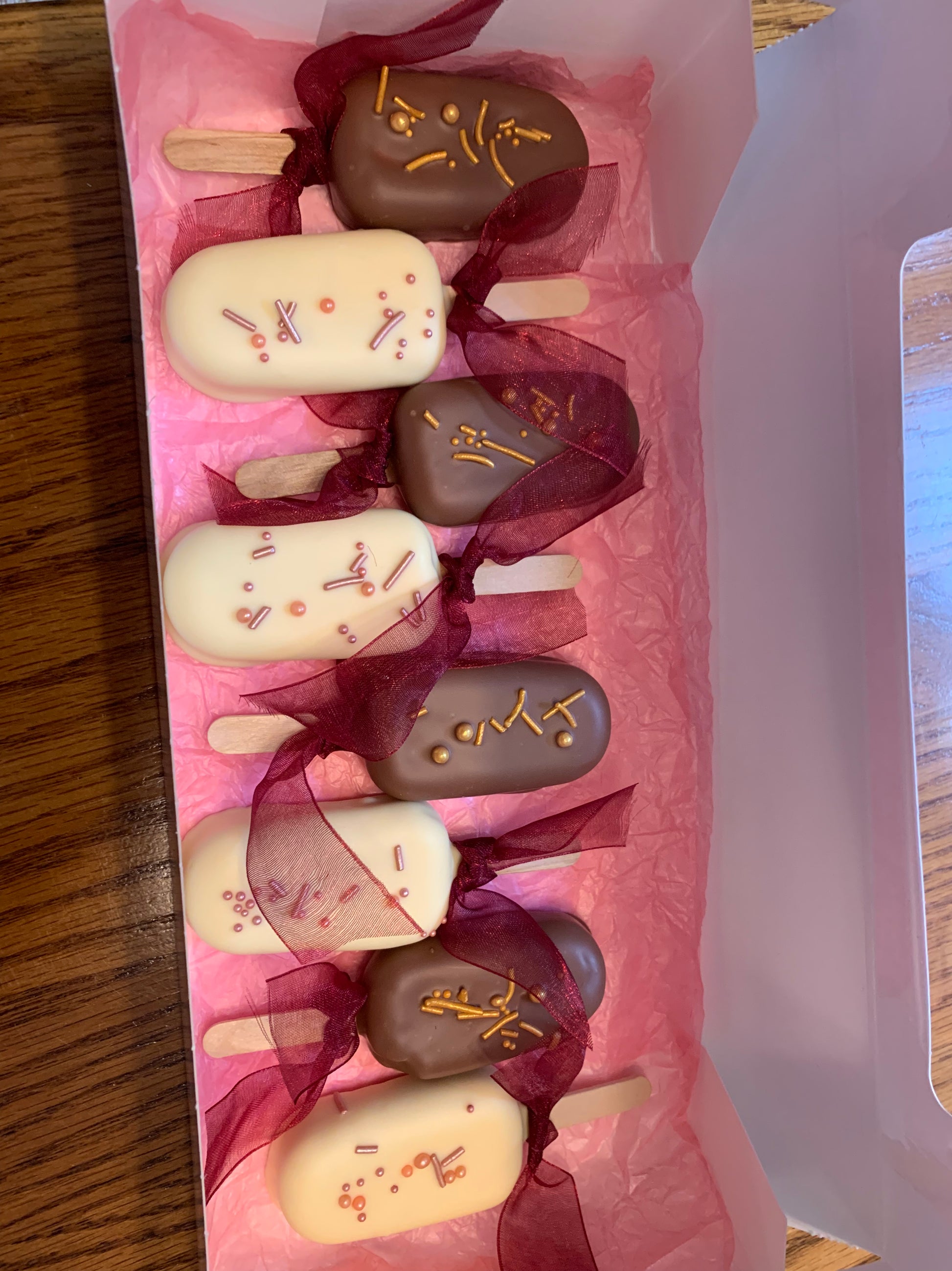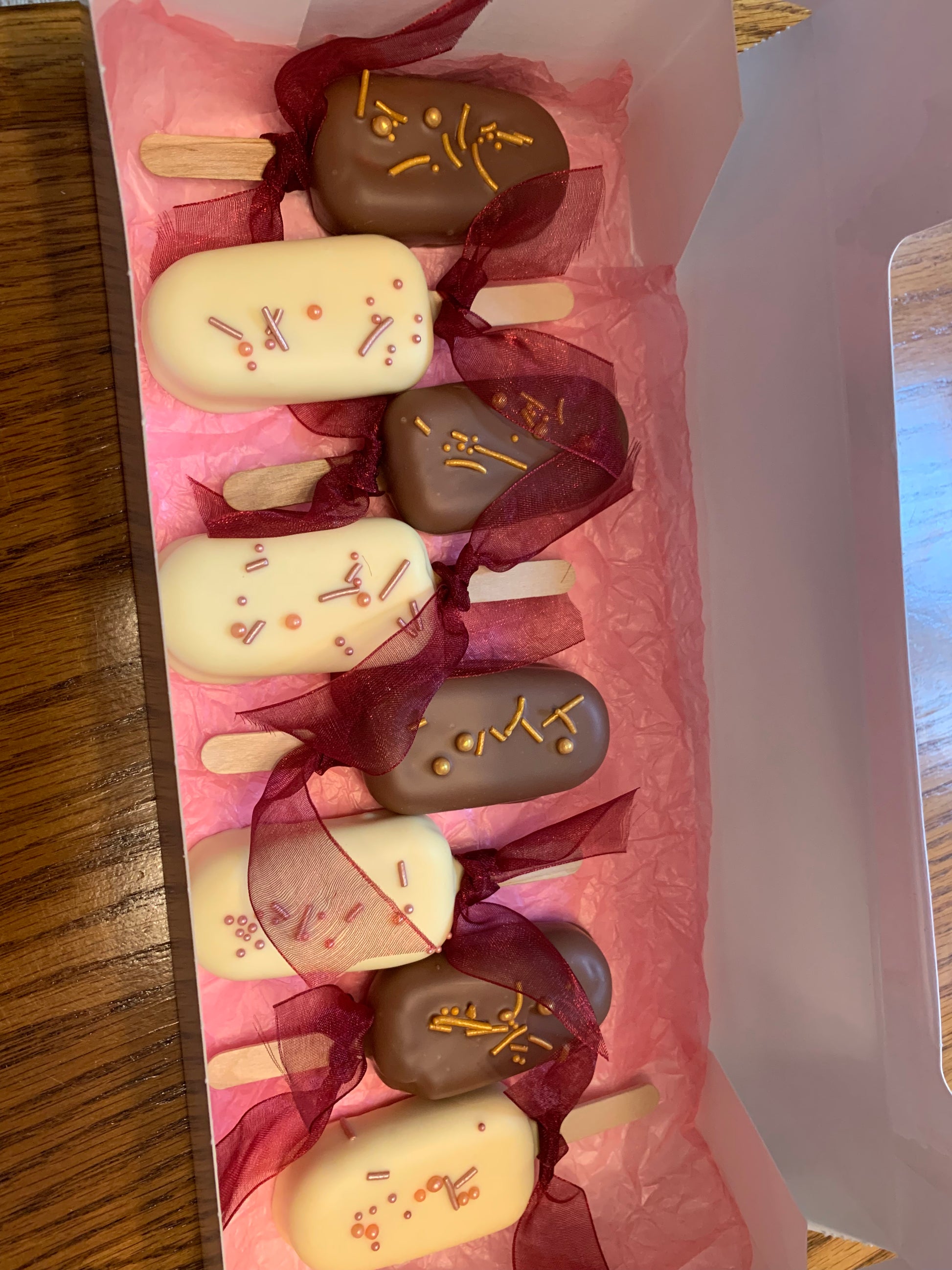 8 pieces of chocolate covered Zefir in the form of small "ice-cream on a stick" in a box measuring 12*5 inch.
